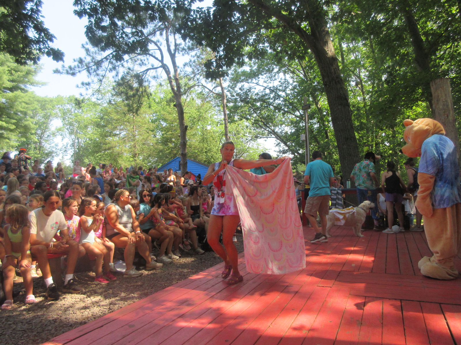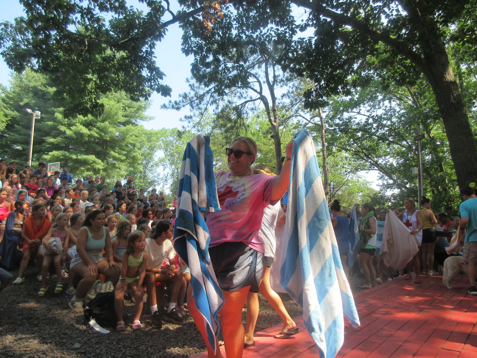 So what do we do? We bring the lost and found to the bunks! At Counselor of the Week (see [Part I]), sometimes we’ll enlist some of our staff or older campers to join us onstage and “model” Briarwood’s latest in towels, t-shirts, water bottles and more, moving through the aisles so that our campers and bunk counselors and see.
